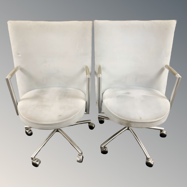 A pair of Danish Erik Jorgensen designed 'Partner' chrome-framed executive swivel armchairs, in pale blue suede upholstery, each 64 cm wide x 96 cm high