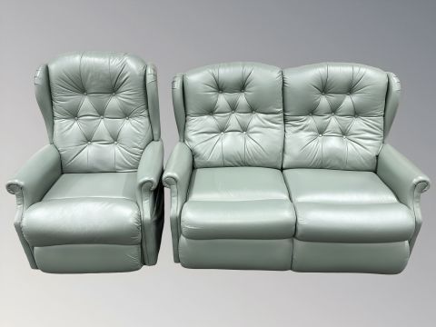 A La-z-boy green leather two seater settee, length 140 cm, and matching manual reclining armchair.