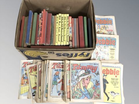 Vintage children's annuals and comics including Billy the Kid, Buffalo Bill, Tammy, Debbie, etc. (1 box)
