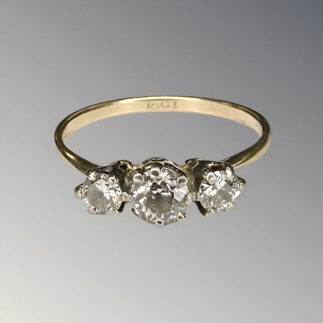 An 18ct gold three-stone diamond ring, size Q