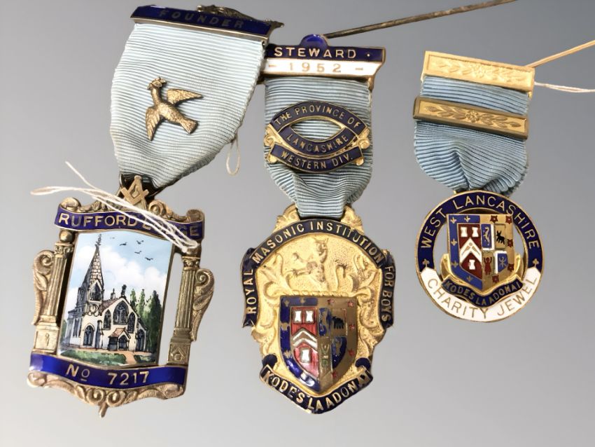 A briefcase of Masonic ephemera, silver gilt medal and two others, books and satchels etc