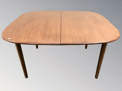 A 20th century G Plan teak extending dining table with internal leaf, unextended 140 cm L x 120 cm W x 73 cm H.