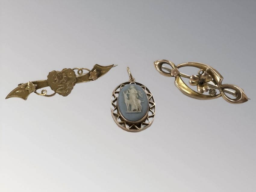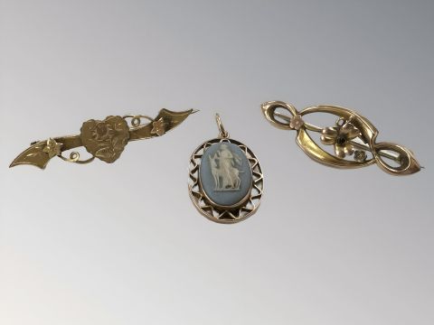 Two 9ct gold brooches and a similar Jasperware pendant