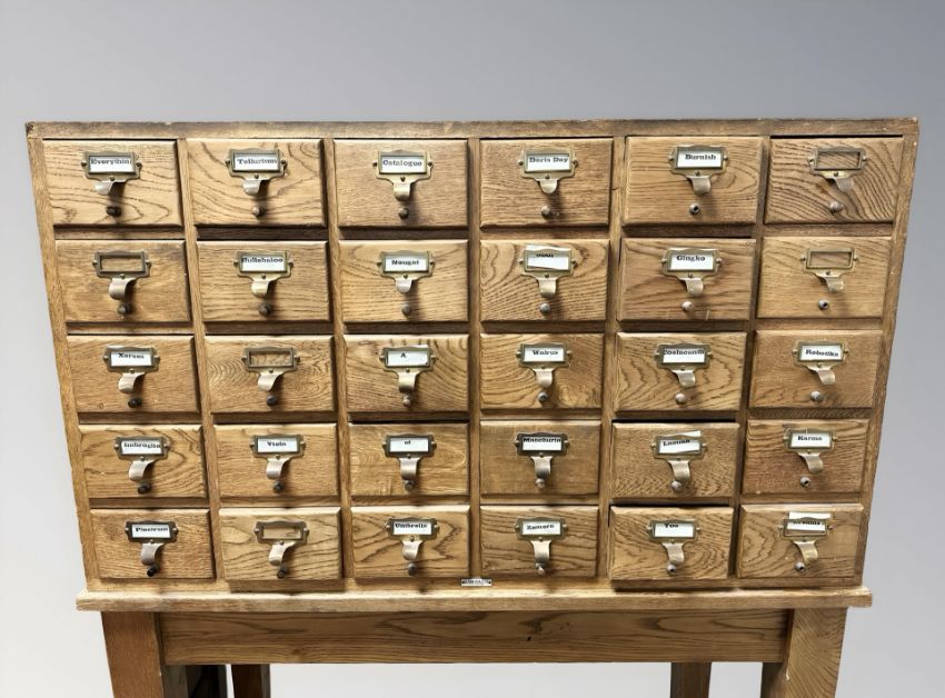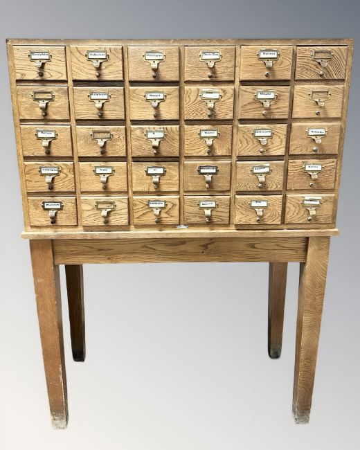 An early 20th century Libraco London oak thirty drawer index chest on stand, overall 100 cm W x 52 cm D x 133 cm H.
