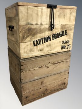 A pine crate and a further hardwood crate with stenciled decoration, width 47 cm.