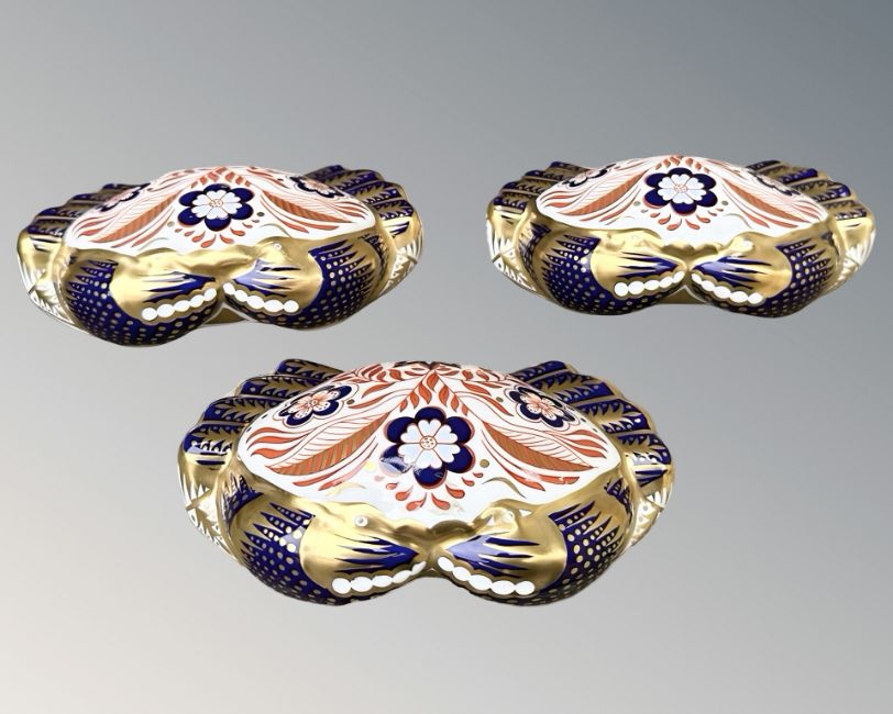 Three Royal Crown Derby Crab paperweights, two with silver stoppers, one without