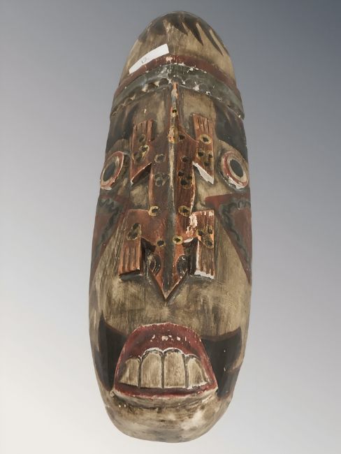 An Angolan carved and painted wooden mask, length 48 cm.
