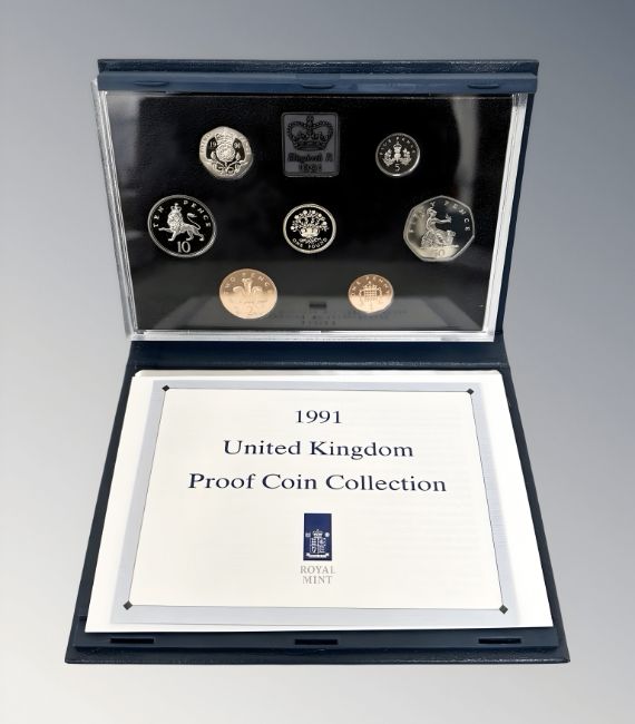 Royal Mint : 1991 United Kingdom Proof Coin Collection, Twenty Years of Decimalisation, 7 coins in all, with booklet, cased.