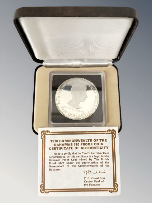 1978 Bahamas Anniversary Prince Charles $10 Silver Coin, 45.1 g, boxed.