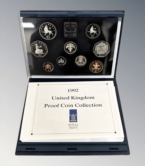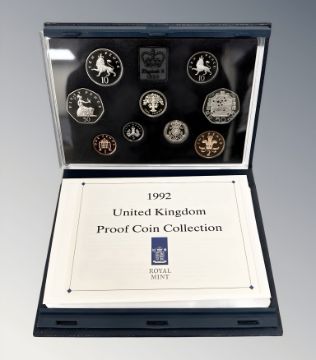 Royal Mint : 1992 United Kingdom Proof Coin Collection, 9 coins in all including the new size 10 pence piece, with booklet, cased.