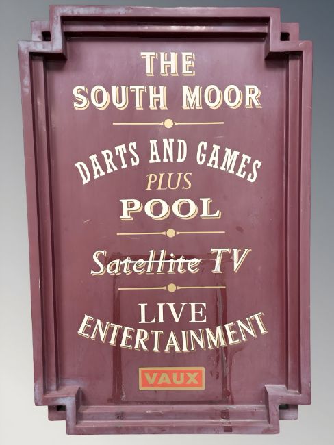 A fibreglass pub sign 'The South Moor', 120 cm x 80 cm.