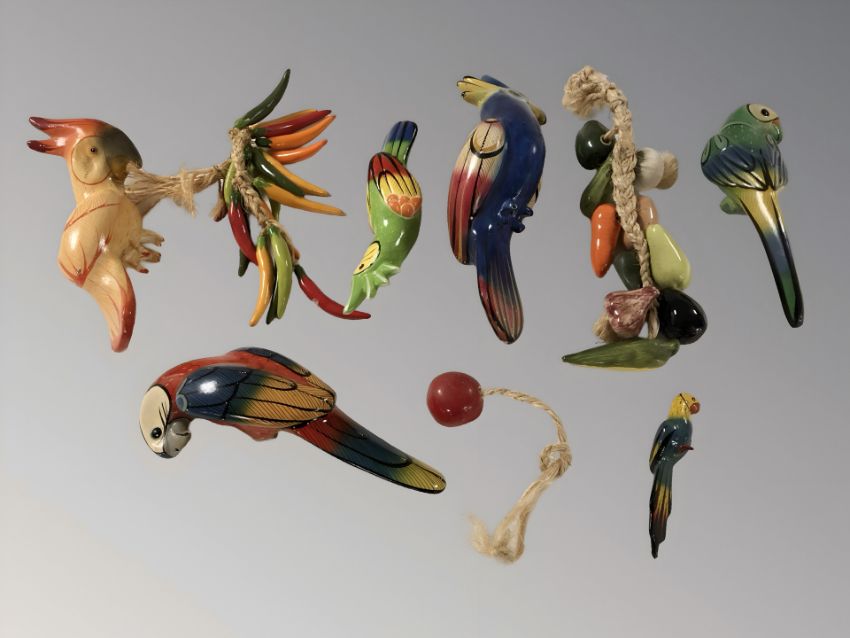 A group of decorative Mexican ceramic birds of paradise on metal hanger