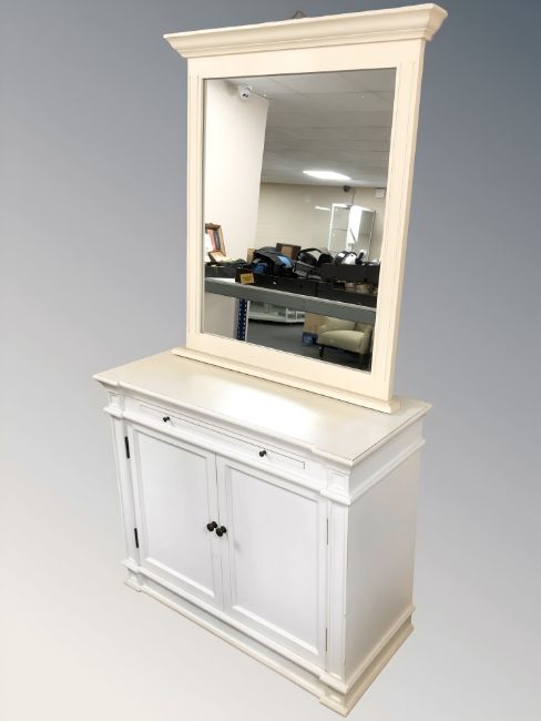 A modern painted side cabinet, 98 cm x 43 cm x 81 cm and similar mirror above