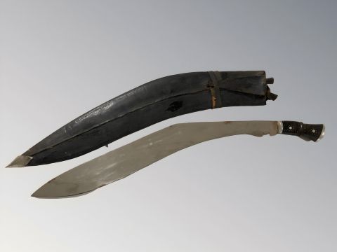 An oversized Indian Kukri knife with 59 cm blade, in sheath with two accompanying smaller knives