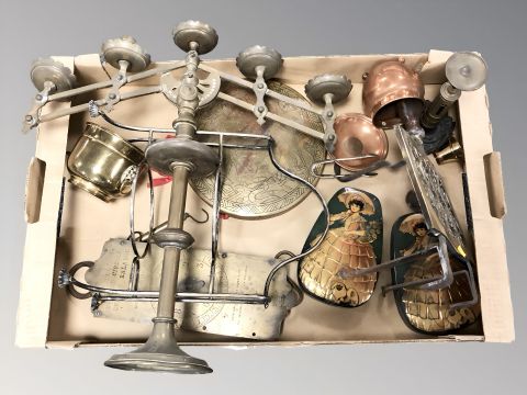 Metal wares including a brass candelabrum, Salter's balance scale, trivets, etc (one box)