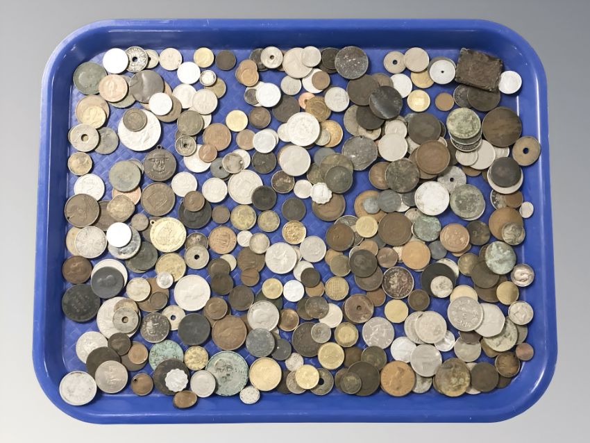 A collection of world coins and tokens including a Victorian Gothic Florin, later pre-decimal pieces etc