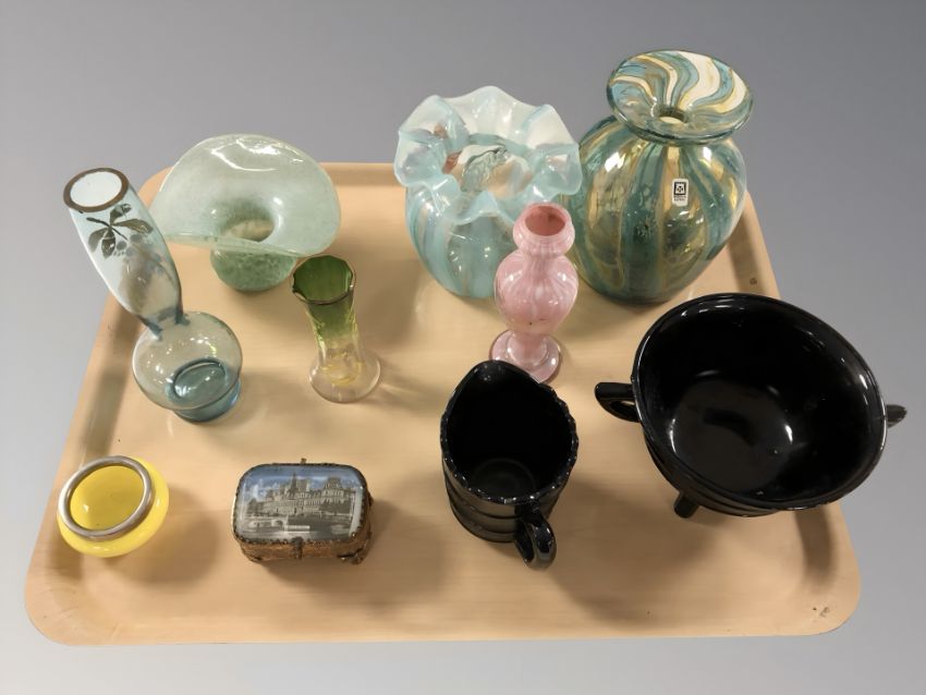 A Mdina glass vase, other coloured glass items, gilt metal trinket box depicting the Hotel De Ville etc