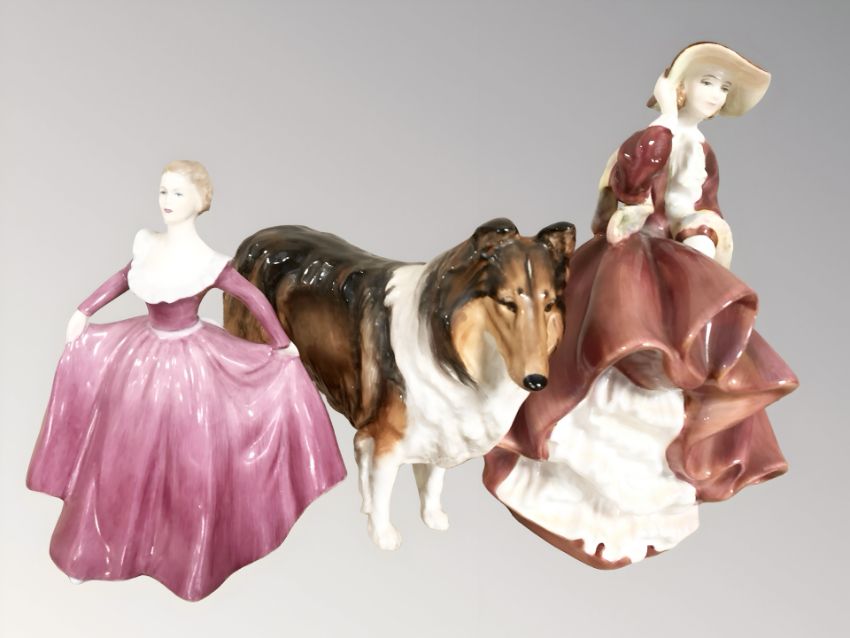 A Royal Doulton figure Top O' The Hill HN 1834, Coalport figure 'Joanne' and Royal Doulton Collie HN 1058