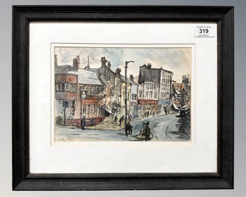 Charles Herbert "Charlie" Rogers (1930-2020) : Figures in a Street Outside The Fighting Cocks Public House, pen and ink with watercolour, signed, 16 cm x 24 cm, framed.