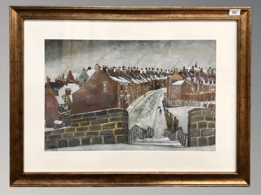 Charles Herbert "Charlie" Rogers (1930-2020) : A Winter Landscape with Terraced Housing on a Hillside, oil on paper, signed and dated 1978, 39 cm x 60 cm, framed.