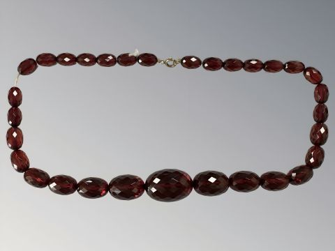 A string of amber/Bakelite beads with gold clasp