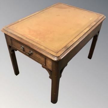A reproduction yewwood two tier occasional table fitted drawers, width 67 cm and a further mahogany lamp table with tooled leather inset panel