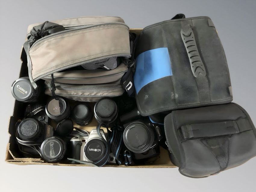 A Canon EOS 1000F camera, further T70 camera, various lenses, Minolta camera etc (1 box)