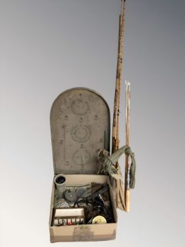 Two vintage split cane fishing rods, tennis racket, bagatelle board, reels, tins and fishing items (1 box)
