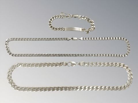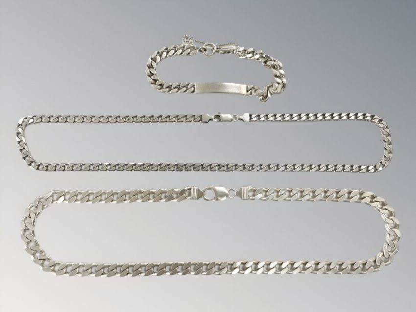 Two silver flat link curb necklaces and an identity bracelet