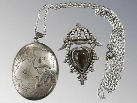 A silver locket, length 4.5cm. on later chain, and a silver and moonstone brooch