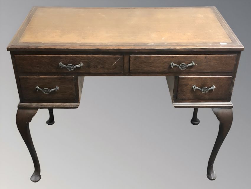 An early 20th century oak four drawer writing desk on cabriole legs, 96 cm wide x 50 cm deep x 76 cm high