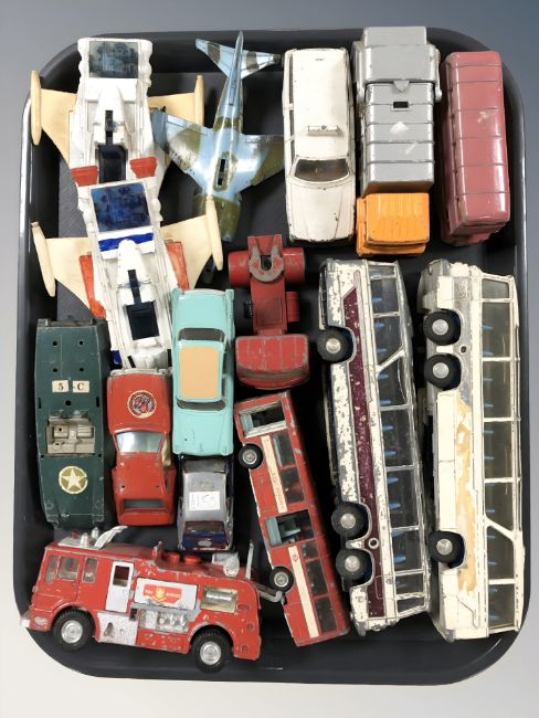 A group of 20th century die cast cars, buses and other vehicles including Dinky.