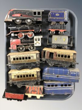 20th century tin plate locomotives passenger cars including wind up examples.