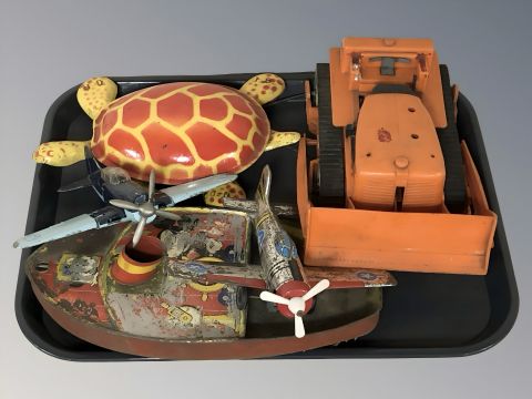 A group of tin plate die cast models including air craft, boat, bull dozer etc