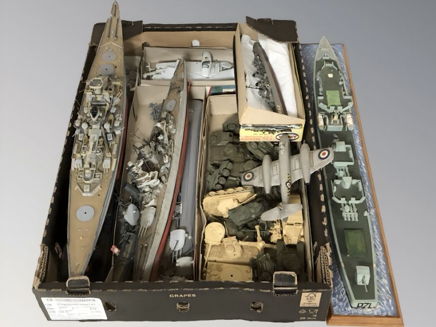 A group of scale model battleships, military vehicles, aircraft, etc. (1 box)