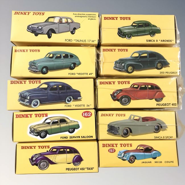 A group of Atlas Editions Dinky die cast cars, four sealed in cellophane
