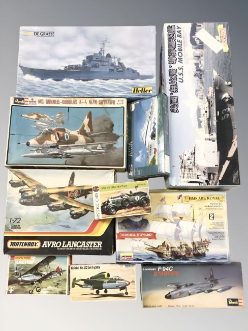 A group of aircraft and naval scale modelling kits including Revell, Matchbox etc