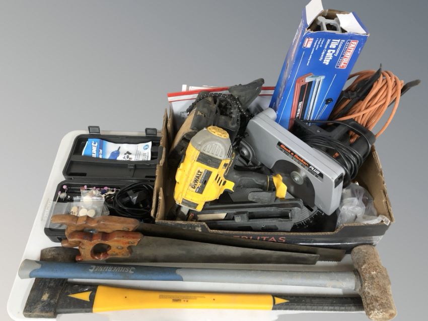 Modern power tools including DeWalt nail gun, Black & Decker circular saw, together with a group of hand tools, dremel, etc. (1 box)
