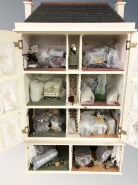 A large contemporary Georgian style doll's house, with front garden, terrace and well furnished interior including furniture, paintings, light fittings, curtains, etc, overall 64 cm W x 75 cm D x 112 cm H.
