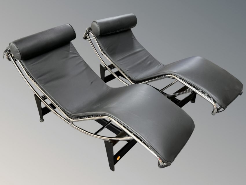 A pair of Le Corbusier style chrome and black leather lounge chairs, length 160 cm