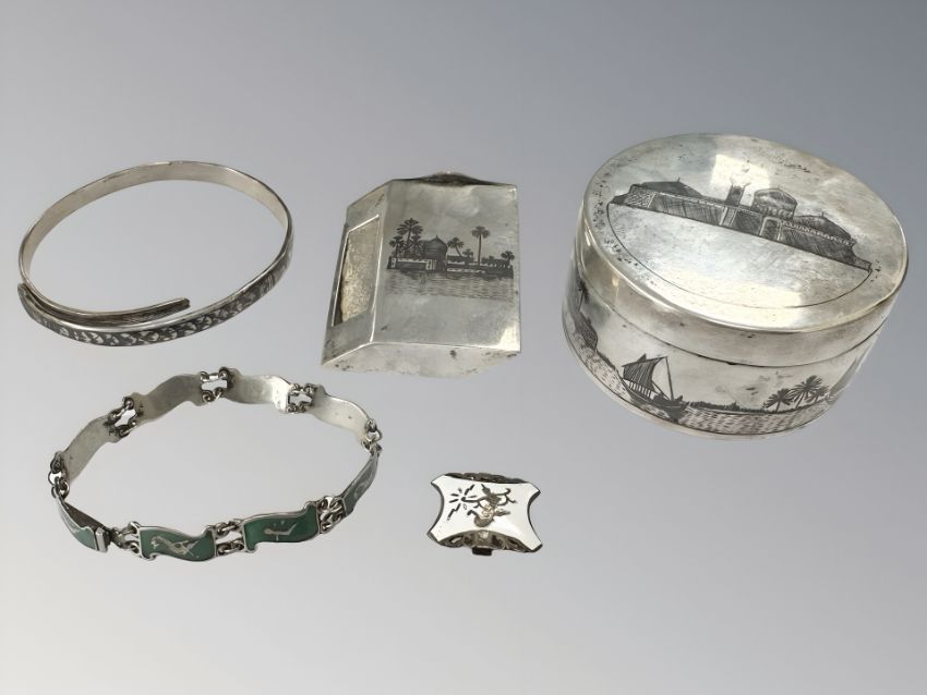 A group of Siam silver items including vesta, trinket box, bracelet etc