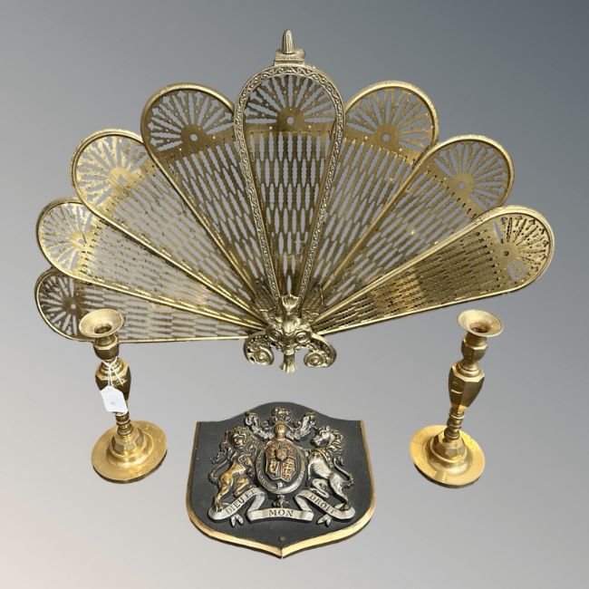 A brass peacock firescreen, height 57 cm, a pair of candlesticks and a ceramic royal crest.