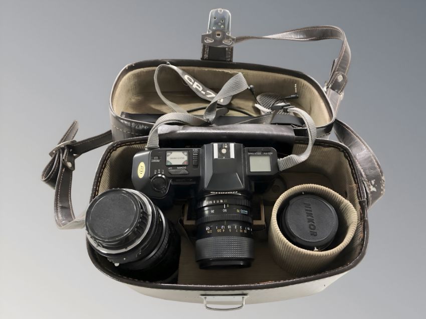 A camera bag containing Chinon CP-7M camera, Vivitar 90-230mm lens, Chinon F=55mm lens, etc.