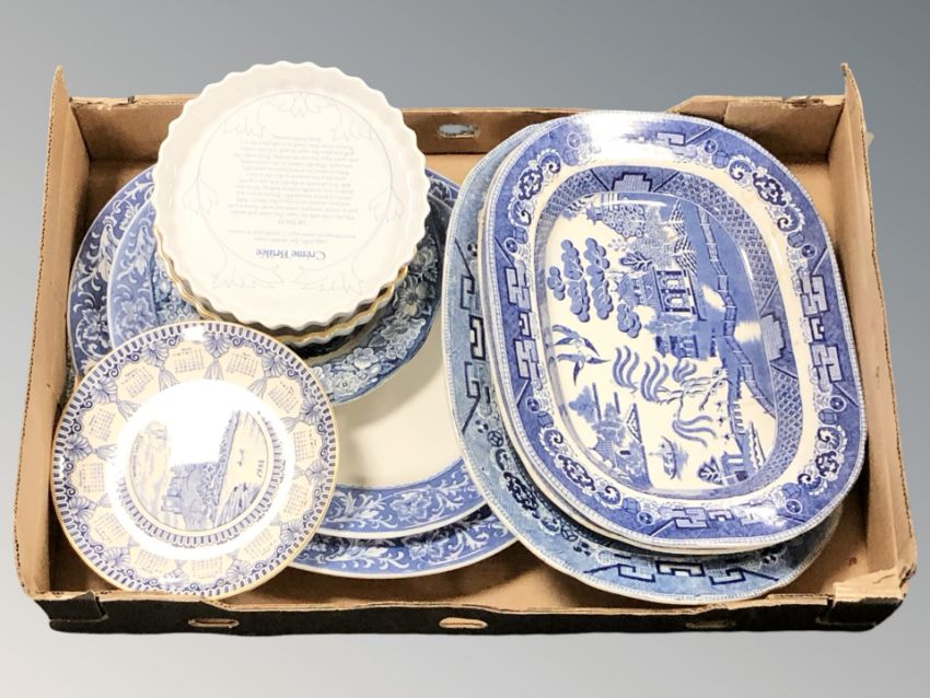 A group of blue and white willow pattern meat plates, Masons calendar plates, Evesham and other wares. (1 box)