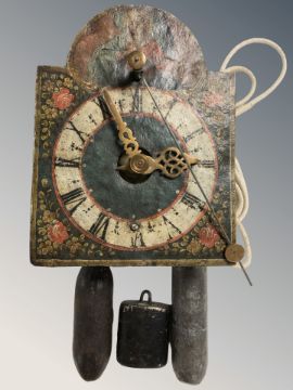 An early 20th century wall clock movement with painted dial and weights.