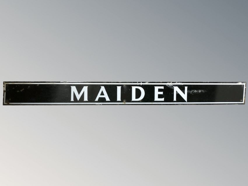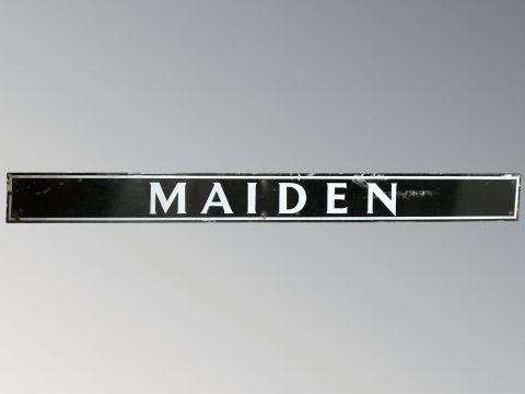 A 20th century enameled metal railway sign 'Maiden', length 153 cm.