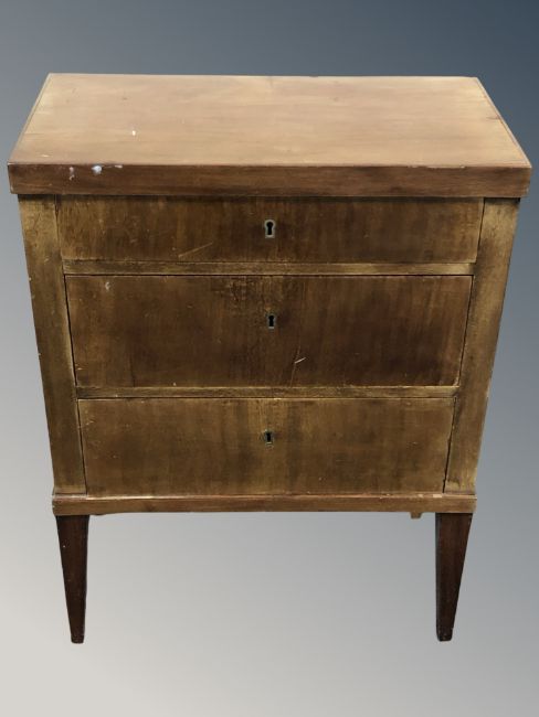 A 19th century continental mahogany three drawer chest, 50 cm W x 27 cm D x 67 cm H.