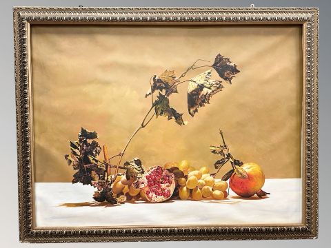 20th Century School : Still life with fruit and grapes, oil on canvas, 121 cm x 91 cm.
