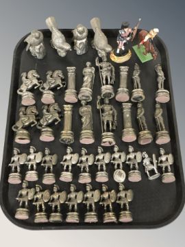 A die cast metal chess set, further bird ornaments, Scots Guards figure and a further Britain's figure of a cowboy on horseback.