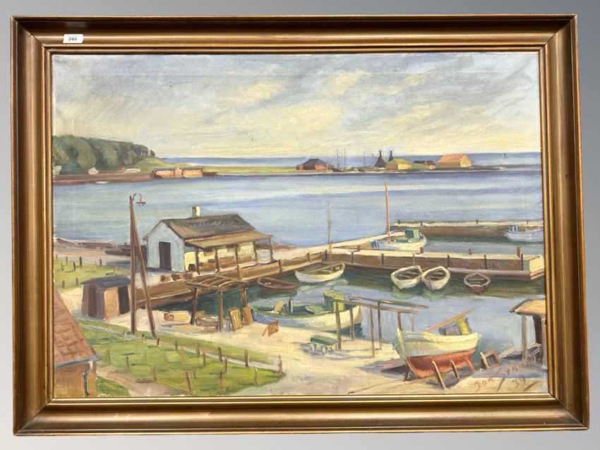 Danish School : A boathouse at low tide, oil on canvas, 97 cm x 68 cm.